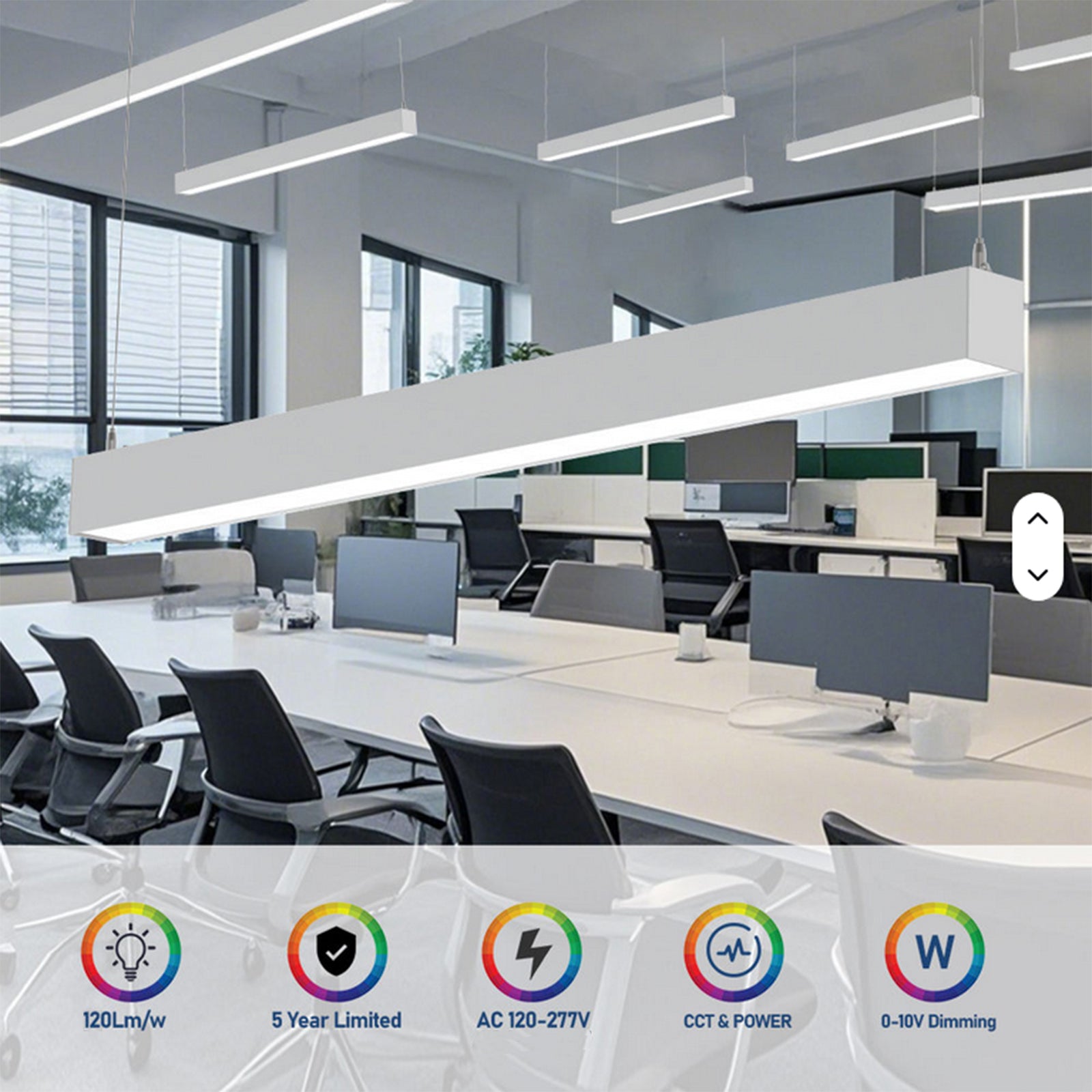 - 0-10V dimmable, with universal voltage (120–277V) compatibility.